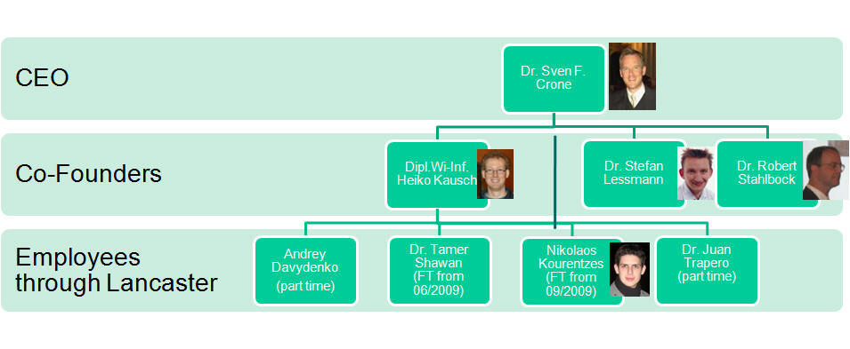 In addition to the core team consisting of Dr. Sven F. Crone (CEO, Managing Director), Heiko Kausch (Application Development), Dr. Stefan Lessmann (Senior Consultant & Implementation Support) and Dr. Robert Stahlbock (Senior Consultant), BIS3lab™ is closely connected to the abovementioned research units and draws upon a world-wide network of experts and expertise to offer its customers cutting-edge technology in various areas of forecasting and prediction. As a young and emerging company, BIS3lab designs solutions in close liaison with business partners, who have the unique opportunity to actively participate in system development cycles and find their needs and requirements addressed in the best possible way to achieve a maximum degree of efficiency and effectiveness.